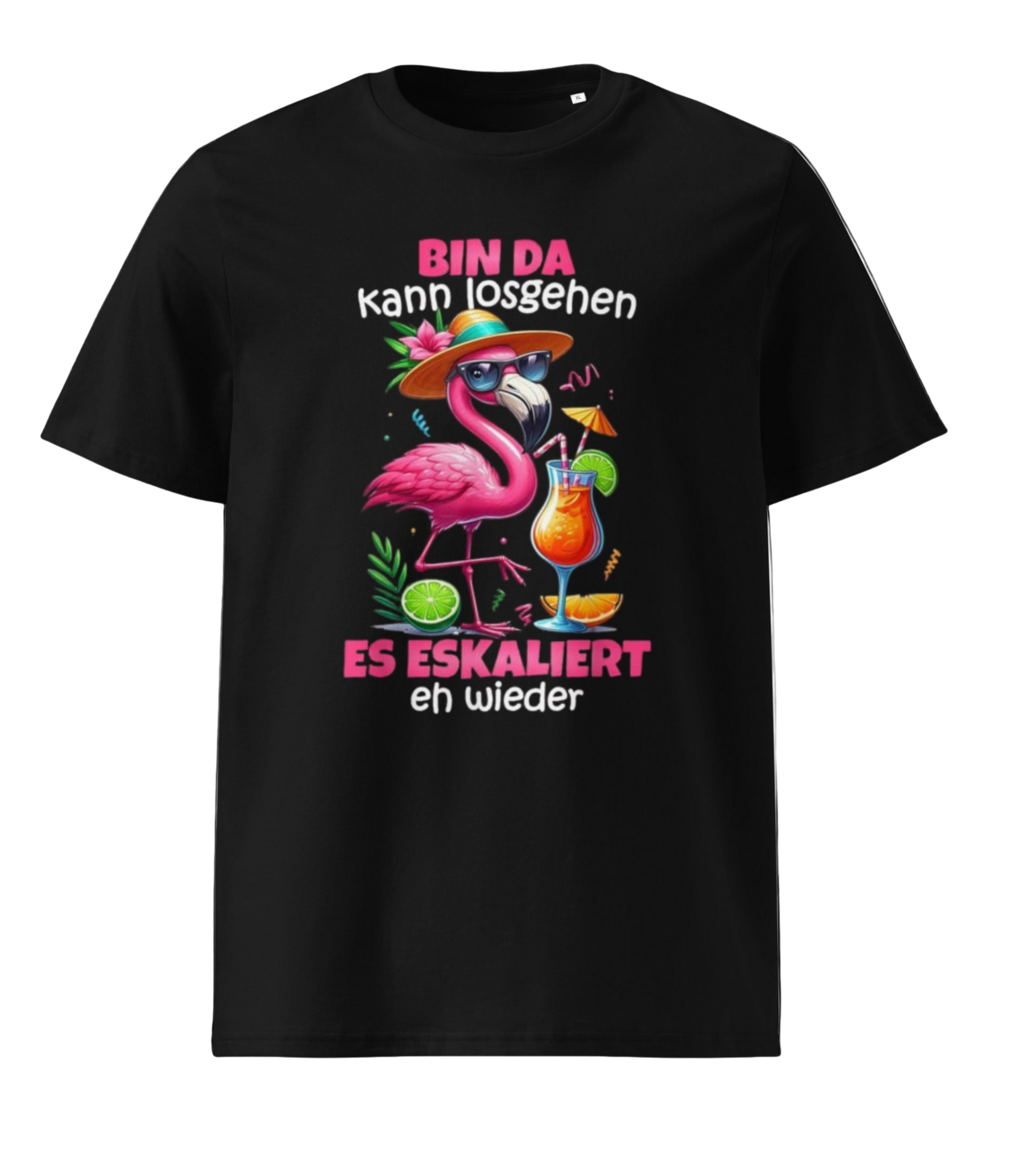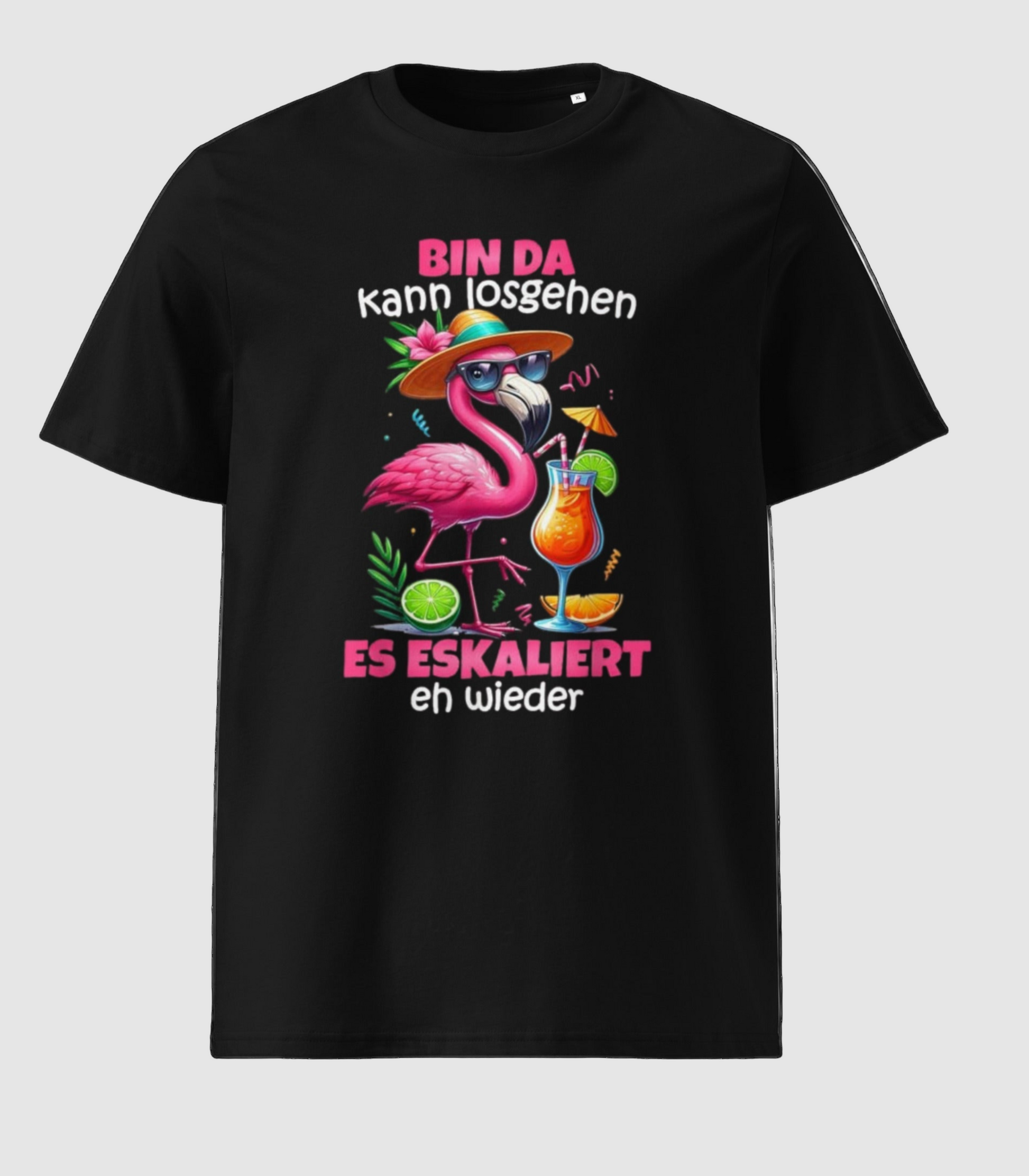 Lustiger Flamingo mit Cocktail Party Gruppen Outfit für Mallorca Perfektes Geschenk für Freundin zum nächsten Mädelsabend oder als Junggesellinnenabschied Outfit. Flamingo mit Cocktail und Spruch "Bin da kann losgehen und ja es escaliert eh" Damen Gruppenschiff Kreuzfahrt Gruppen Flamingo Outfit! Nicht nur zum Feiern auf der nächsten Kreuzfahrtparty geeignet, sondern auch für berüchtigte Unpünktliche, die gerne zu spät kommen, ist dieses Flamingo-Kostüm eine lustige Geschenkidee. JGA Flamingo! Dieser Bin Da Can Go It Escalates Eh - Flamingo Malle wurde von Damen Flamingo Group Kostüm für JGA Mallorca entworfen.